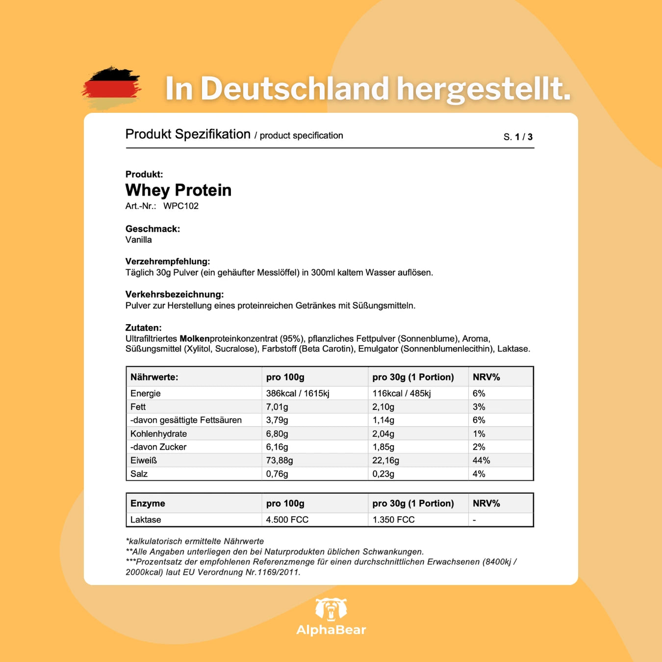 Der AlphaBear Proteinshake ist ein hochwertiges Whey-Proteinpulver mit Vanillegeschmack. Es dient der Herstellung eines proteinreichen Getränks und unterstützt den Muskelaufbau, die Regeneration und eine eiweißreiche Ernährung.